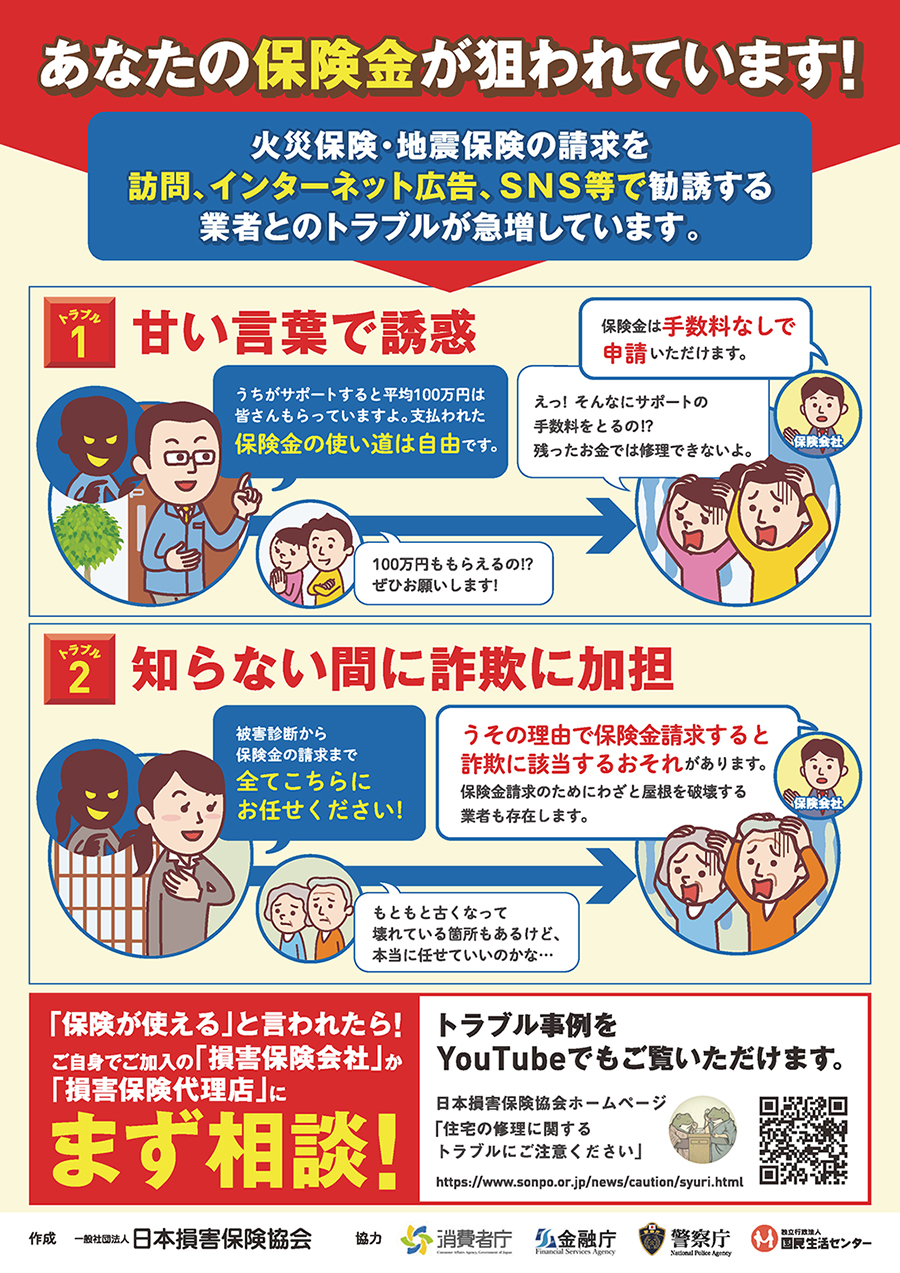住宅修理などに関し、「保険が使える」と言って勧誘する業者とのトラブルが増加しています。