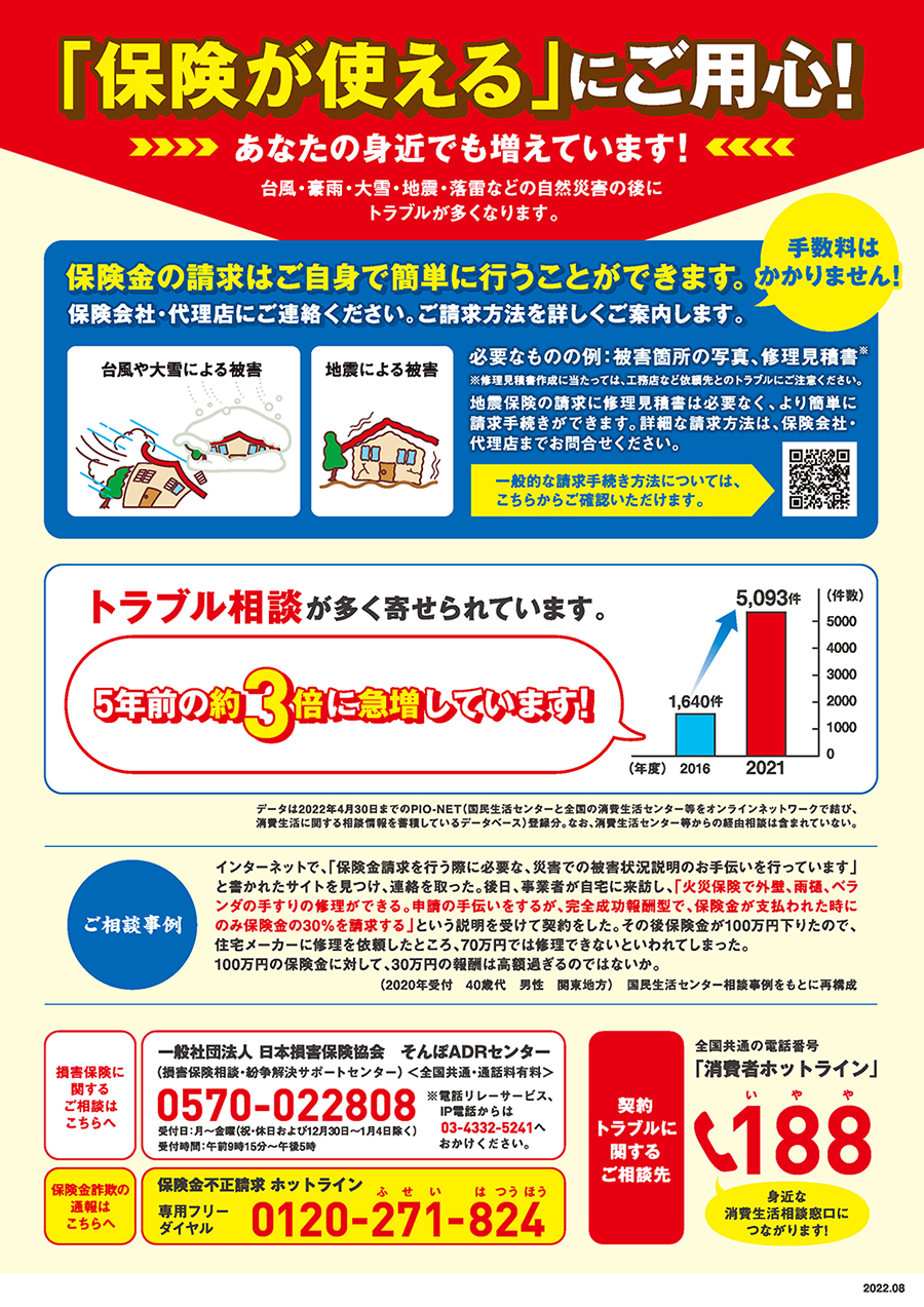 といった勧誘で高額な手数料が請求されるトラブル相談も増加しています。保険金の請求は保険契約者ご自身で